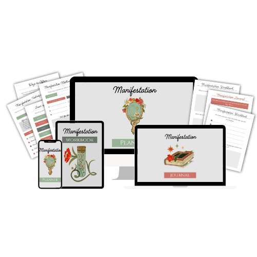 In addition to the planner, you will also get 100 journal prompts about manifesting, a journal and workbook using the prompts, and custom Canva eCovers.